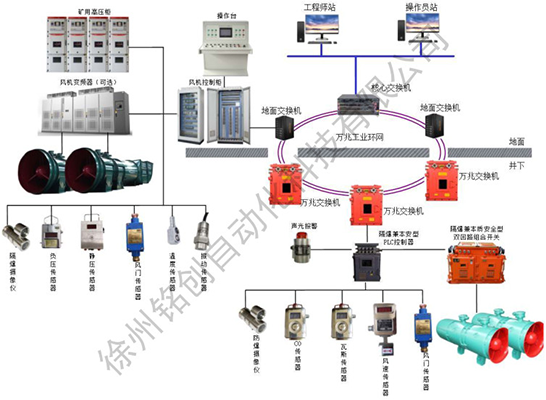 礦用智能通風(fēng)監(jiān)控系統(tǒng)應(yīng)用工業(yè)計(jì)算機(jī)及PLC技術(shù)對(duì)礦用通風(fēng)機(jī)進(jìn)行連續(xù)在線監(jiān)控并結(jié)合視頻聯(lián)動(dòng)技術(shù)實(shí)現(xiàn)主通風(fēng)機(jī)不停風(fēng)倒機(jī)、故障自動(dòng)倒機(jī)。系統(tǒng)同時(shí)具備高壓無(wú)擾動(dòng)快切功能,當(dāng)運(yùn)行高壓電源突發(fā)故障,停止供電時(shí),系統(tǒng)自動(dòng)切換到備用高壓,保障風(fēng)機(jī)不停機(jī),進(jìn)一步保證整個(gè)主通風(fēng)系統(tǒng)的安全。在線監(jiān)控的風(fēng)機(jī)運(yùn)行參數(shù)包括:風(fēng)機(jī)入口靜壓、全壓、風(fēng)速、流量、入口溫度(即井下出氣溫度)、電機(jī)振動(dòng)、軸承溫度、定子繞組溫度、電機(jī)輸入電壓、電流、轉(zhuǎn)速、功率和總功率、風(fēng)機(jī)效率、正反風(fēng)信號(hào)等。系統(tǒng)保障通風(fēng)機(jī)的安全運(yùn)行和方便通風(fēng)機(jī)的性能測(cè)試,根據(jù)通風(fēng)機(jī)操作流程實(shí)現(xiàn)通風(fēng)系統(tǒng)的無(wú)人值守。
