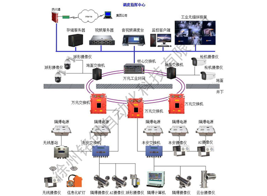 視頻監(jiān)控及大屏顯示系統(tǒng)可以實現(xiàn)地面監(jiān)控人員直接對井下情況進行實時監(jiān)控,能直觀的監(jiān)視和記錄井下工作現(xiàn)場的安全生產情況,能及時發(fā)現(xiàn)事故苗子,防患于未然,也能為事后分析事故提供有關的第一手圖像資料。系統(tǒng)根據(jù)實際井下應用情況,使用多種傳輸方式包括光纖、網(wǎng)線、雙絞線、WiFi/4G/微波無線等;多種產品類型包括隔爆攝像儀、本安攝像儀、AI攝像儀、執(zhí)法儀、PDA、信息化礦燈等;多種供電方式來選擇相應的監(jiān)控產品。基于“云、邊、端”結構的煤礦大腦,可實現(xiàn)人工智能監(jiān)控。配合多種形式存儲服務器、流媒體服務器、視頻解碼及多途徑顯示方式形成完整的煤礦視頻監(jiān)控系統(tǒng)。